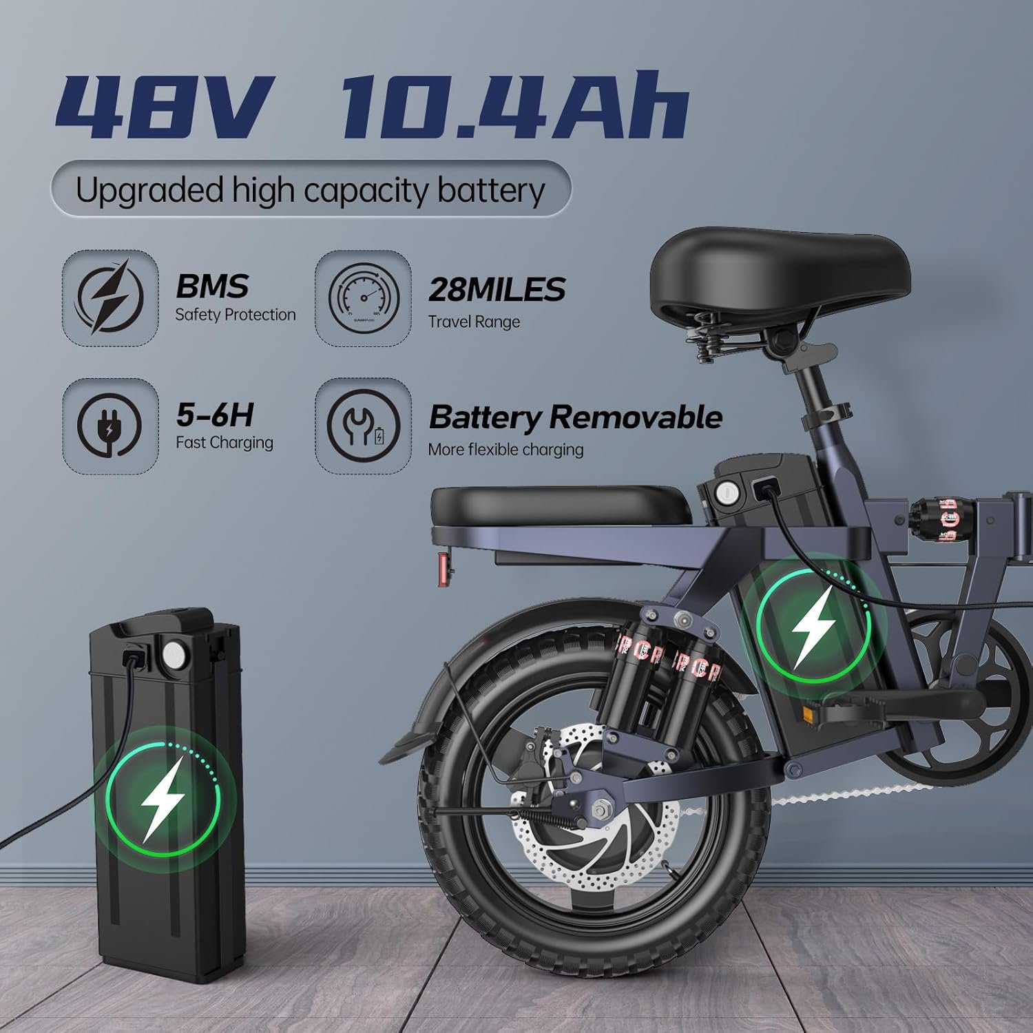 • Powerful and Efficient Performance: Powered by a 400W motor with a peak output of 500W. this e-bike comes equipped with a 499Wh removable battery that charges in just 5 hours. It can travel up to 28 miles on a single charge. climb 37-degree inclines effortlessly. and reach speeds of 20mph safely. Weighing 63.9 lbs. it supports a maximum load of 220 lbs and features 14×2.125 inch wheels for energy efficiency and grip.