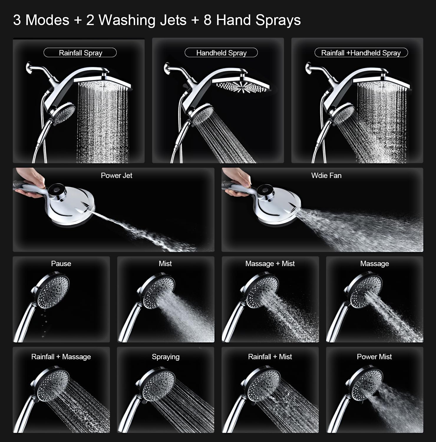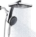 - Larger coverage shower heads with handheld spray combo. our large 12 inch square shower head allows for full body water coverage. Equipped with 10 spray settings hand held shower head. you can enjoy cozy showering. extra 2 different mode power jets can clean your pets or creash your bathroom and bath easily